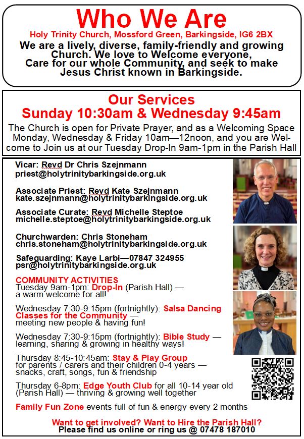 You can find us on Mossford Green, Barkingside, IG6 2BX. Our Facebook site is https://www.facebook.com/HolyTrinityBarkingside (including a live stream of our 10:30 a.m. Sunday service).