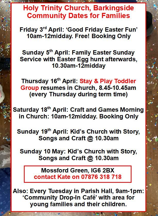 Click posters below for more information about Alpha; Lent Gatherings; Lent & Easter Programme; Tuesday-Drop-In for all; Stay & Play for 0-4yrs olds; Edge Youth Club for 9-14yrs old; Salsa Dancing Classes on Wednesdays; Holy Trinity’s key dates for 2026